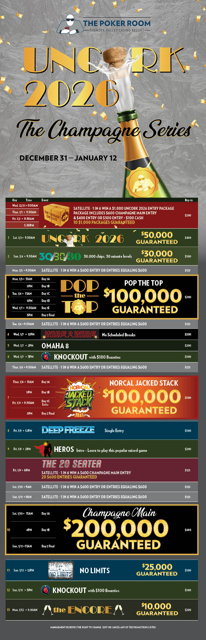 Chris Robertson – $10,498 – wins Event 2 in the 2026 Champagne Series at TVPokerRoom in Thunder Valley Resort in northern California – $30,000 Guarantee $300 Uncork 30/30/30 NLH.